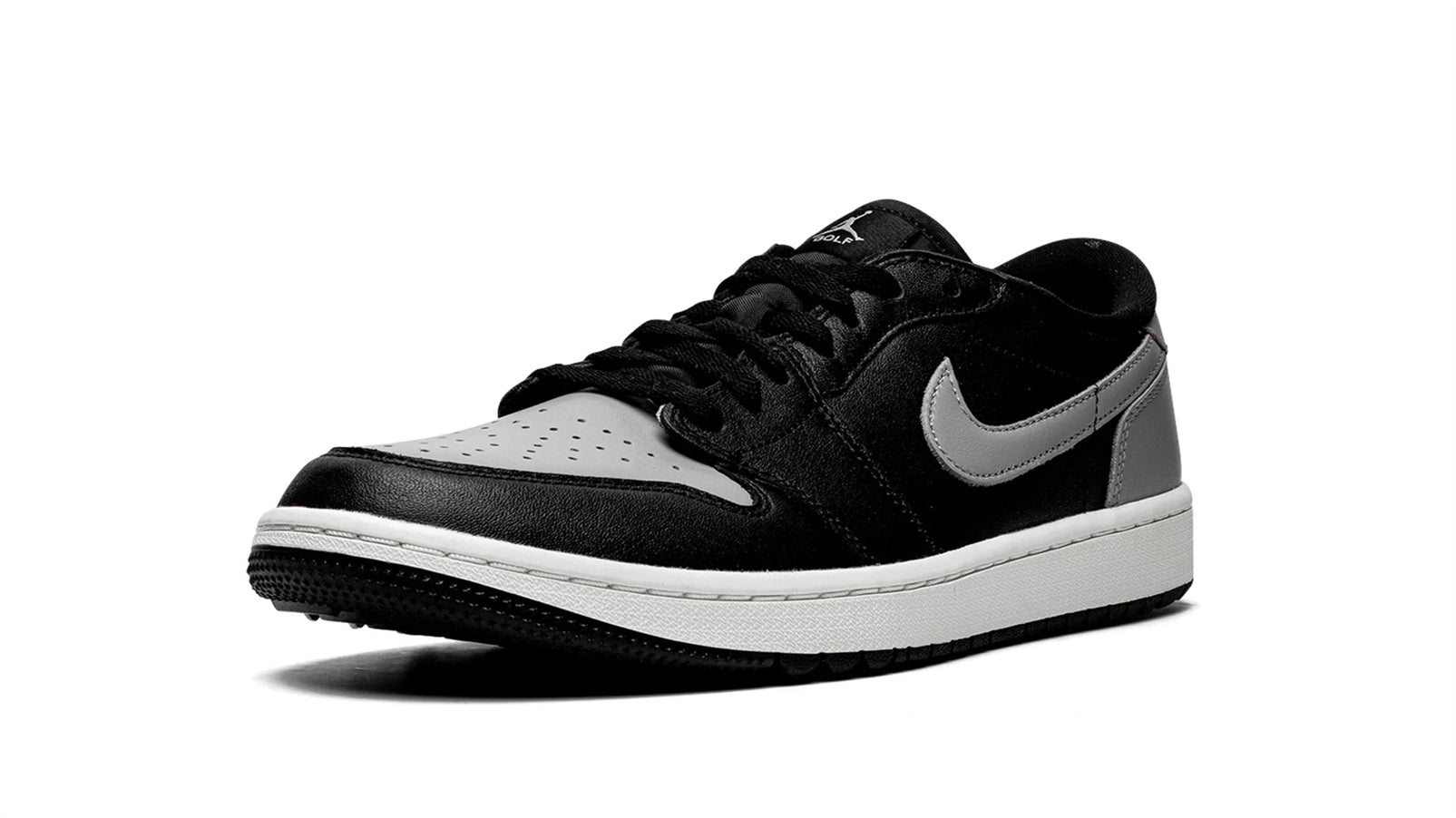 The Jordan 1 Low Golf “Shadow” is a modified version of the classic basketball and lifestyle shoe designed for golf in an original Jordan 1 colorway. From Jordan Brand's golf collection. which also includes several Jordan 1 Lows and the Jordan 4. the Jordan 1 Low Golf “Shadow” nods to the original. black-and-grey colorway of the vintage basketball shoe with its color block. The look replicates the styling of the original “Shadow” colorway with Medium Grey leather on the perforated toe. Swoosh. heel tab. and heel. The toe cap. forefoot. eyelets. mid-panel. and collar are designed in black leather. A black “Wings” logo is found on the back of the shoe. A grey Jumpman and “Golf” branding appear on the black nylon tongue tag. Small nubs on the outsole provide traction on a golf course. Release date: January 20. 2022
