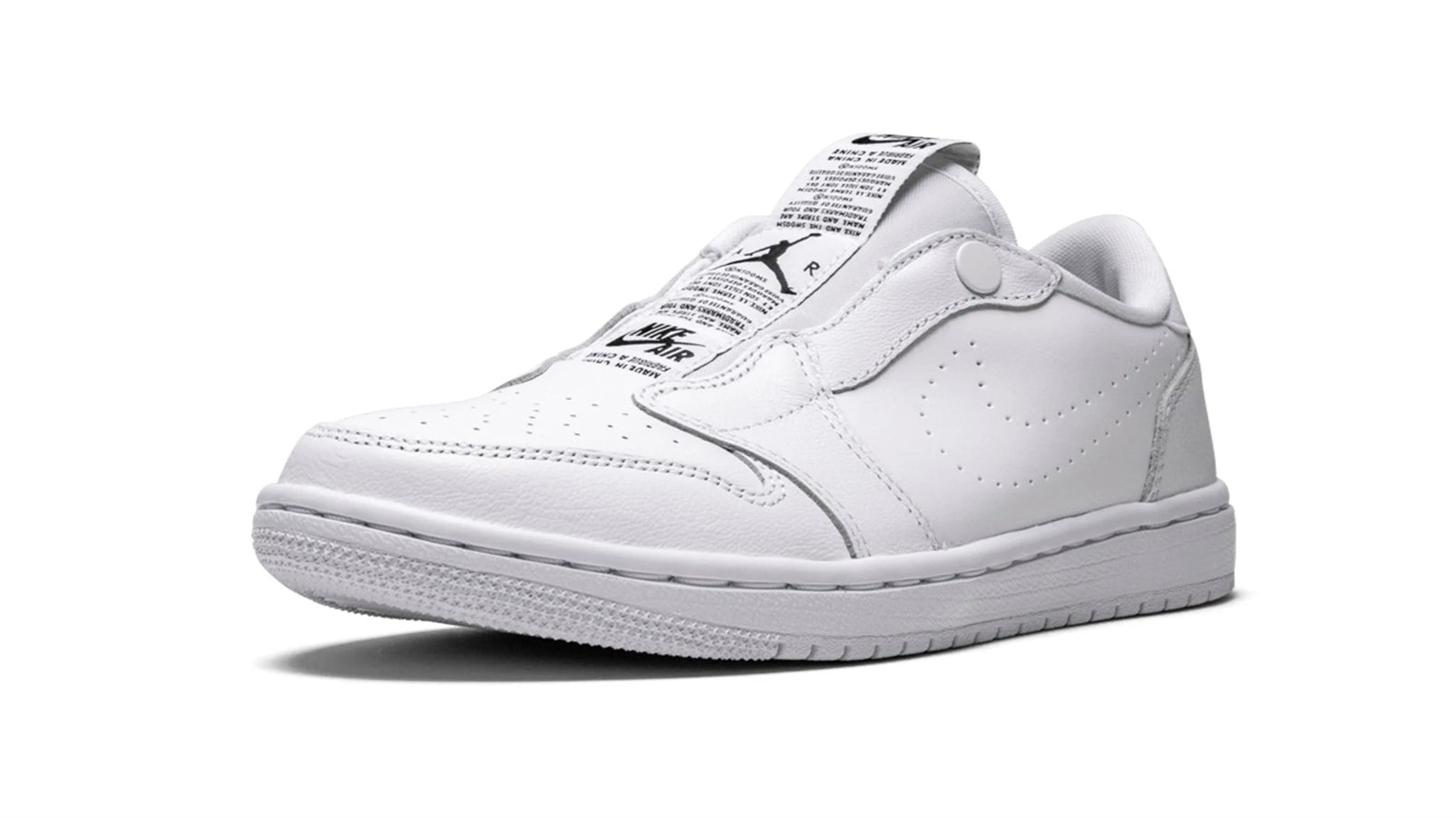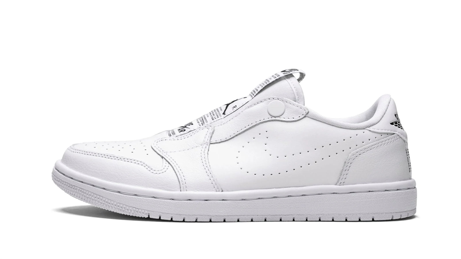 The women's Jordan 1 Low Slip is a unique laceless spin on the low-top Jordan 1. The popular silhouette comes with a perforated midfoot Swoosh and a snap on each side of the ankle collar. The tongue tag is flipped inside-out and rides the length of the shoe's throat and also appears on the heel. The slip-on style does away with the laces. and the Jordan 1 Low Slip is grounded with a standard white sole.