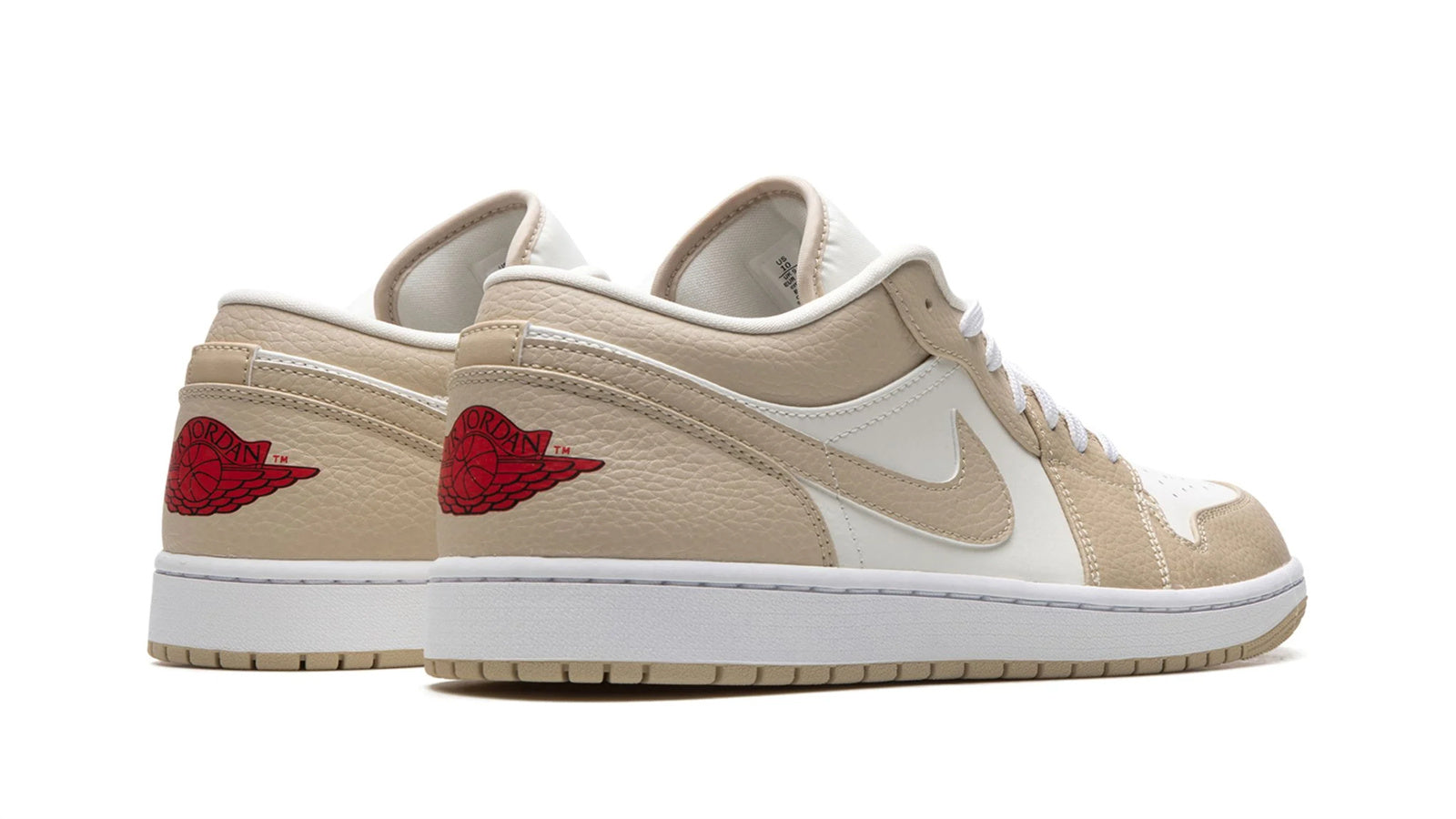 This sneaker features an all-leather upper with a white base and sail rattan overlays around the tongue. heel. Swooshes. and forefoot. The Jumpman logo on the tongue and insole opts for a complementary black tone. while the "Jordan" Wings logo on the heel opts for a university red flair. A white midsole. a rounded perforated toe cap. and a matching lacing system complete the shoe's design.