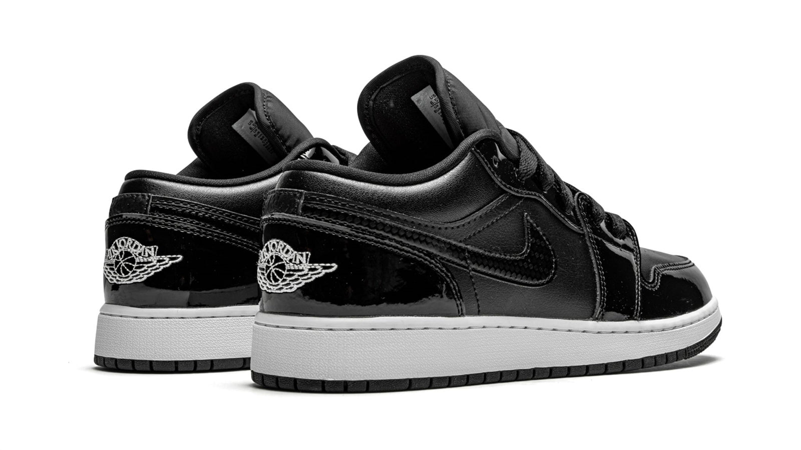 The Jordan 1 Low SE GS “All-Star 2021” is a special NBA All-Star Weekend 2021 colorway of Michael Jordan's first signature shoe in youth sizing. Along with the Jordan 1 Mid of the same nickname. the “All-Star 2021” is a February 2021 release that dresses the beloved Jordan 1 Low in a sleek black-and-white colorway for endless wearability. Glossy black patent leather panels on the forefoot. eyelets. collar. and heel attract attention while retaining a casual appearance. Jordan Brand continues the black monochromatic theme by placing black leather on the perforated toe and on the mid-panel and collar. A white embroidered “Wings” logo can be found on the heel and a tonal carbon-fiber-like texture is added to the side Swooshes. On the black nylon tongue. a white embroidered circular Jumpman motif finishes off the look. Release date: February 12. 2021.