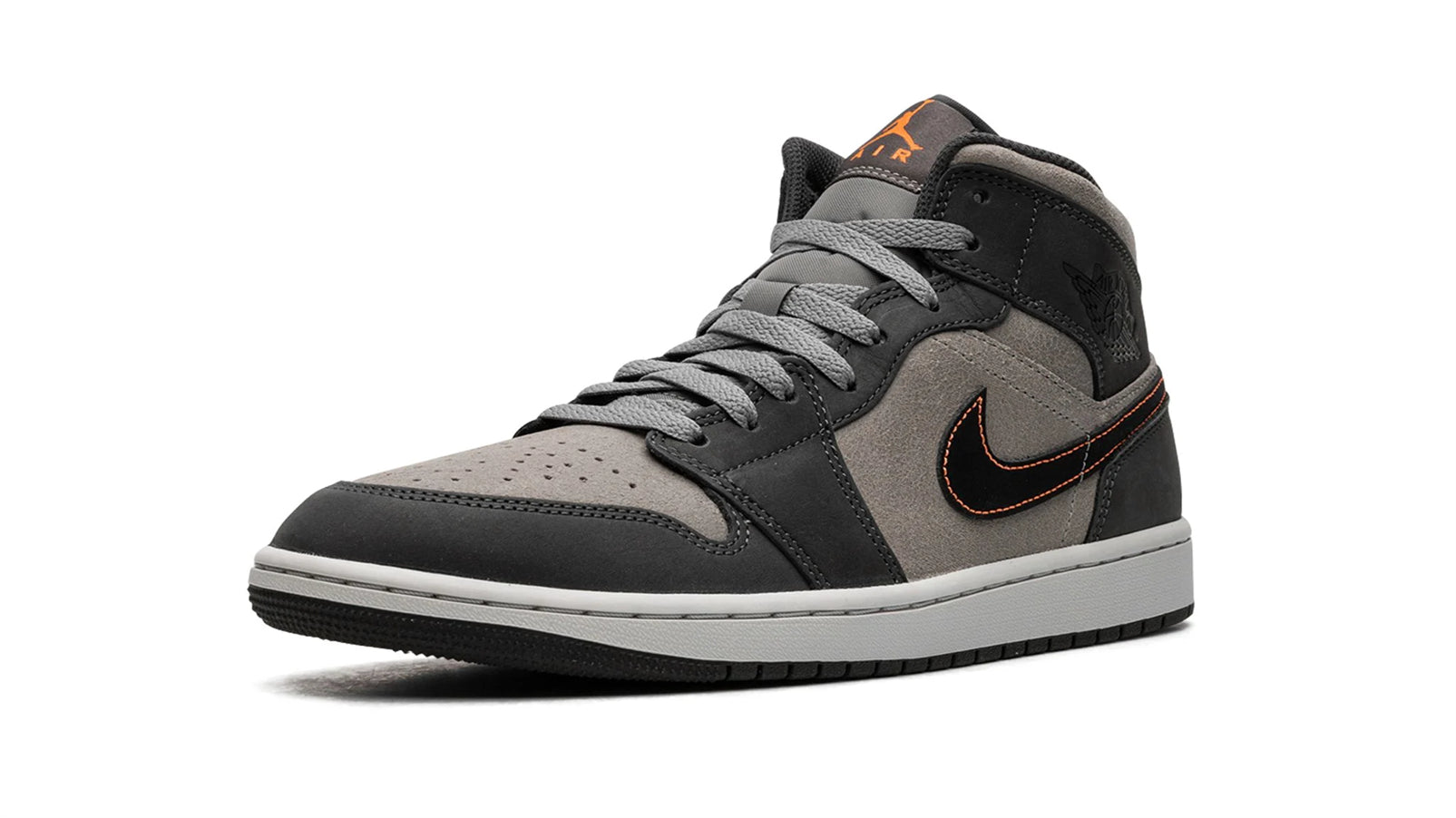 The Jordan 1 Mid SE "Night Stadium" is a colorway of the alternate mid-top silhouette of Michael Jordan's first signature shoe inspired by Halloween. While no Halloween branding or decorations are seen on the “Night Stadium.” the sneaker nonetheless sources inspiration from the spooky holiday with its black. grey. and orange color scheme—the colors most commonly associated with Halloween. The base is designed in grey suede while the overlays are seen in a darker shade of grey nubuck. A black leather Swoosh with Total Orange contrast stitching appears on both sides. Black “Wings” branding is found on the collar while an orange Jumpman is paired with an “Air” logo on the tongue tag. The white midsole and grey outsole complete the look. Release date: October 1. 2023