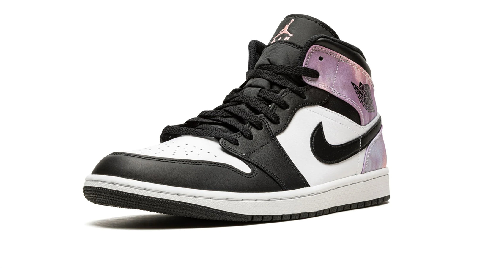 The Jordan 1 Mid SE “Tie-Dye” is a clean look for the mid-top sneaker that calls to mind warm weather style. The aptly named “Tie-Dye” features a purple based tie-dye pattern on the collar and heel overlays. The perforated toe and mid-panel are designed in white leather. Contrasting black leather overlays and Swoosh branding balance the look. A black “Wings” logo is found on the collar and a pink Jumpman with “Air” detailing can be found on the black nylon tongue tag.