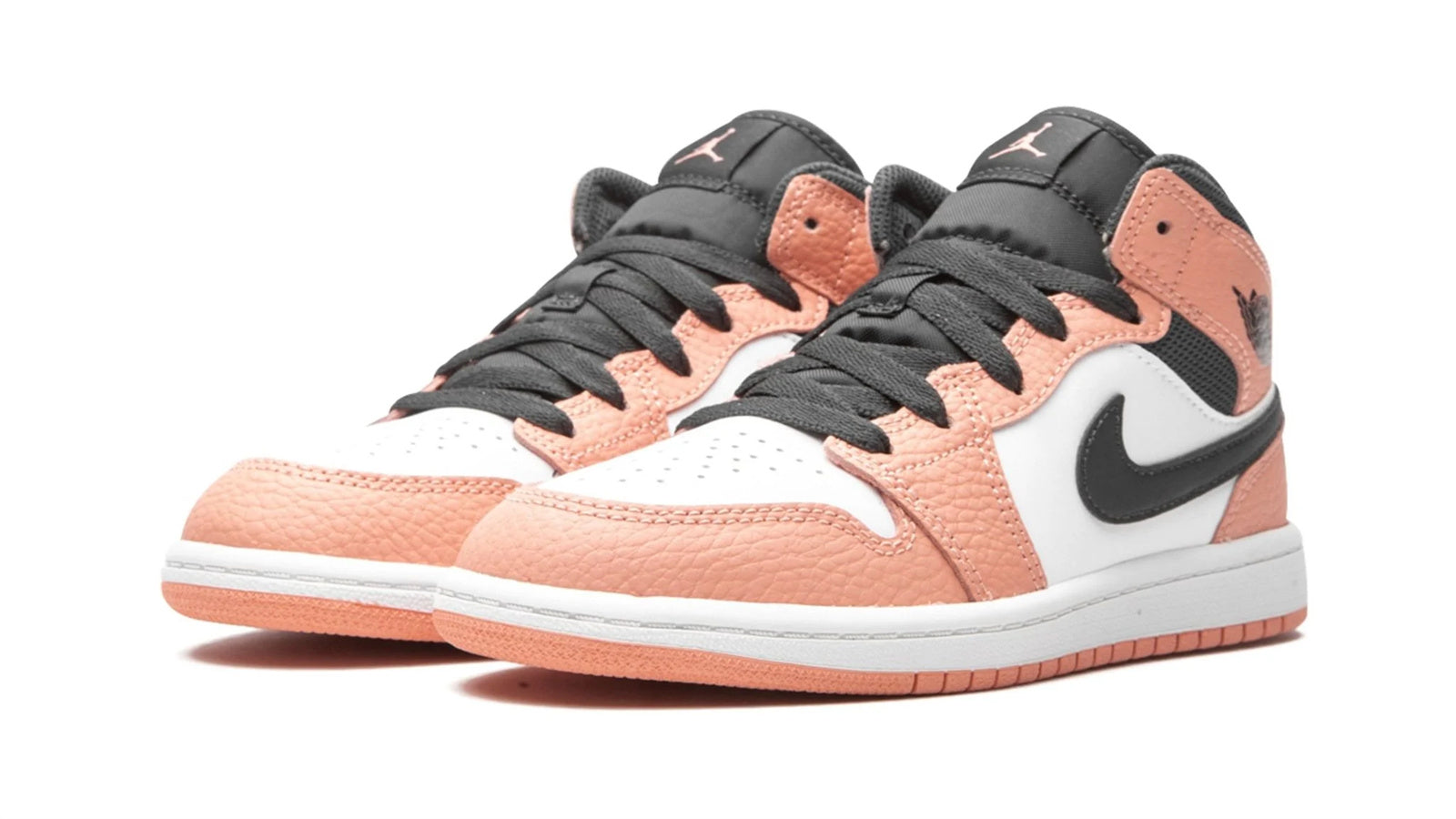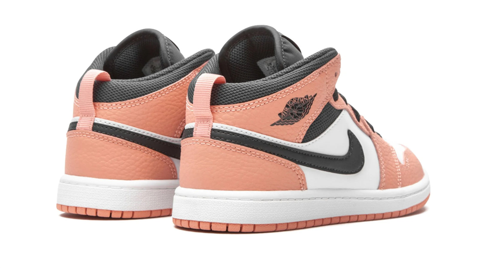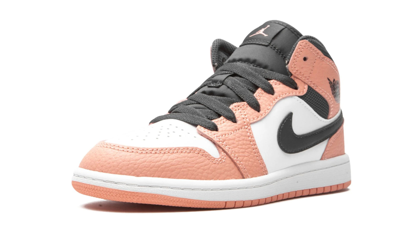 The Jordan 1 Mid PS “Pink Quartz” is a warm and vibrant colorway of Michael Jordan's first signature shoe in its mid-top silhouette. A children's exclusive makeup. the “Pink Quartz” is one of the many modern takes on the Jordan 1 Mid produced by Jordan Brand since the model's rise in popularity in the late 2010s. Smooth white leather appears on the perforated toe and on the mid-panel. Contrasting Pink Quartz tumbled leather panels on the forefoot. eyelets. collar. and heel break up the look and evoke a summertime vibe. A black leather Swoosh appears on both sides and a black “Wings” logo on the collar. The black nylon tongue tag displays a small pink Jumpman logo. The Pink Quartz nylon pull loop on the heel provides functionality. assisting on/off wearability.