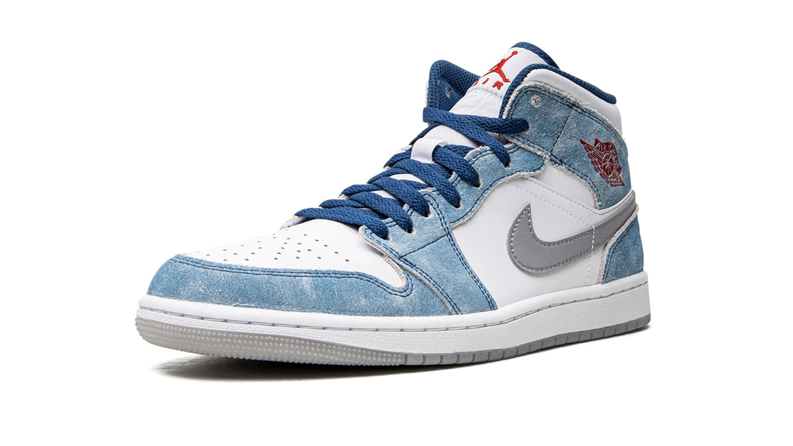 The Jordan 1 Mid “French Blue” is a unique look for the classic sneaker with a pre-faded treatment. The “French Blue” switches up the design of the Jordan 1 Mid's traditional leather build with faded blue suede overlays. White leather appears on the base and a Metallic Silver leather Swoosh logo can be found on both sides of the shoe. A red “Wings” logo appears on the collar and red Jumpman and “Air” detailing is located on the white nylon tongue. Navy laces contrast the shoe's neutral base. Underfoot. a white midsole is paired with a grey rubber outsole to complete the look.